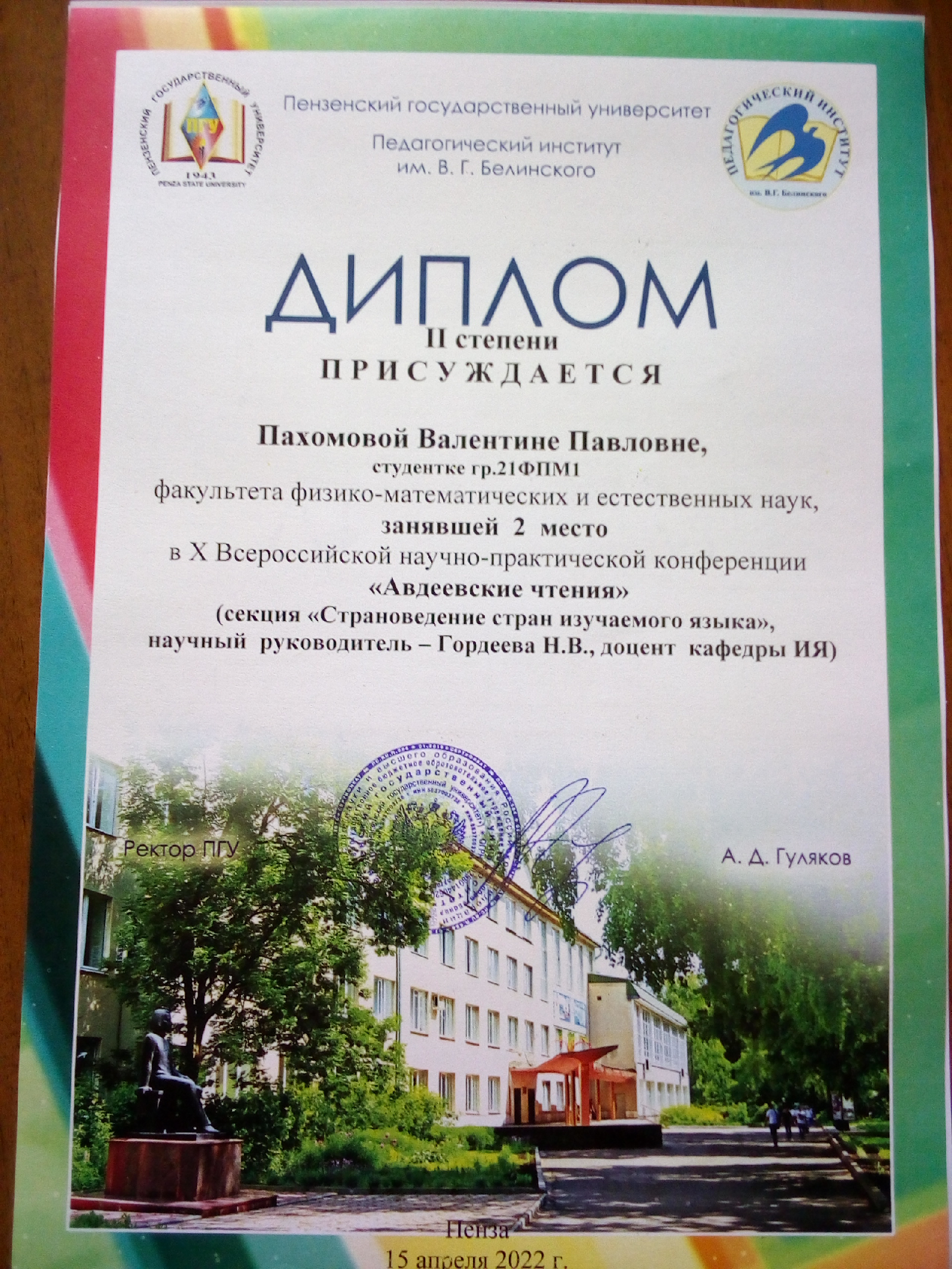 2 место - Пахомова Валентина Павловна, студ. гр. 21ФпМ1 ФФМЕН ФГБОУ ВО «Пензенский государственный университет», г. Пенза.