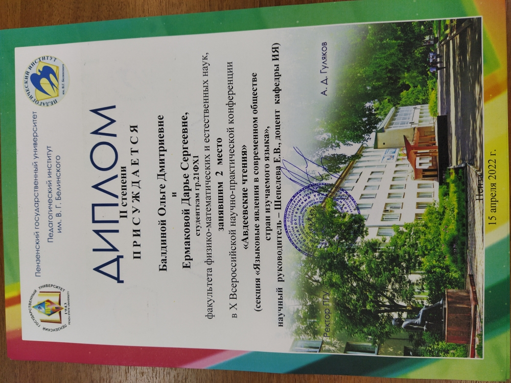 3 место - Девяткина Ирина Алексеевна, Стенькина Ксения Алексеевна, студ. гр. 21ИпО1 ИФФ ФГБОУ ВО «Пензенский государственный университет», г. Пенза.