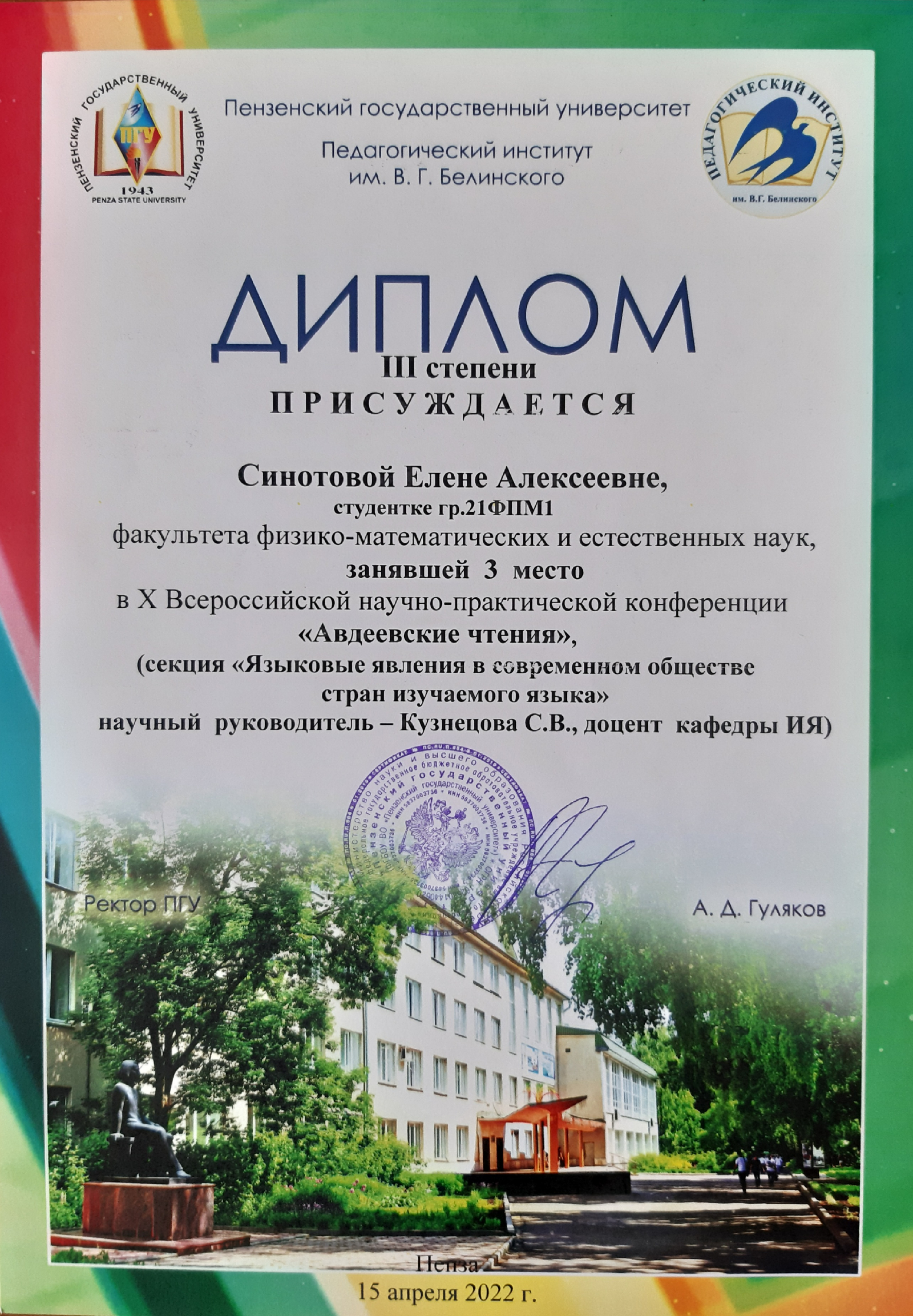 3 место - Синотова Елена Алексеевна, студ. гр. 21ФпМ1, ФФМЕН ФГБОУ ВО «Пензенский государственный университет», г. Пенза.