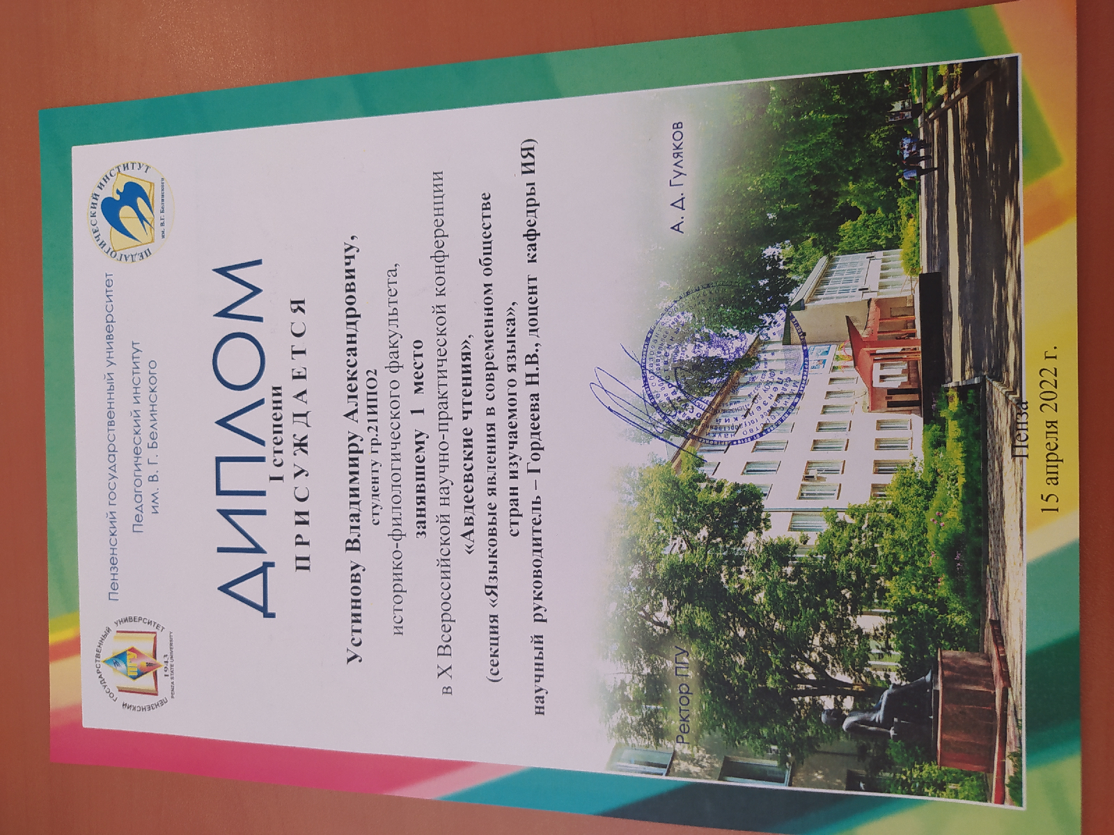 1 место – Устинов Владимир Александрович, студ. гр. 21ИпО2 ИФФ ФГБОУ ВО «Пензенский государственный университет», г. Пенза.