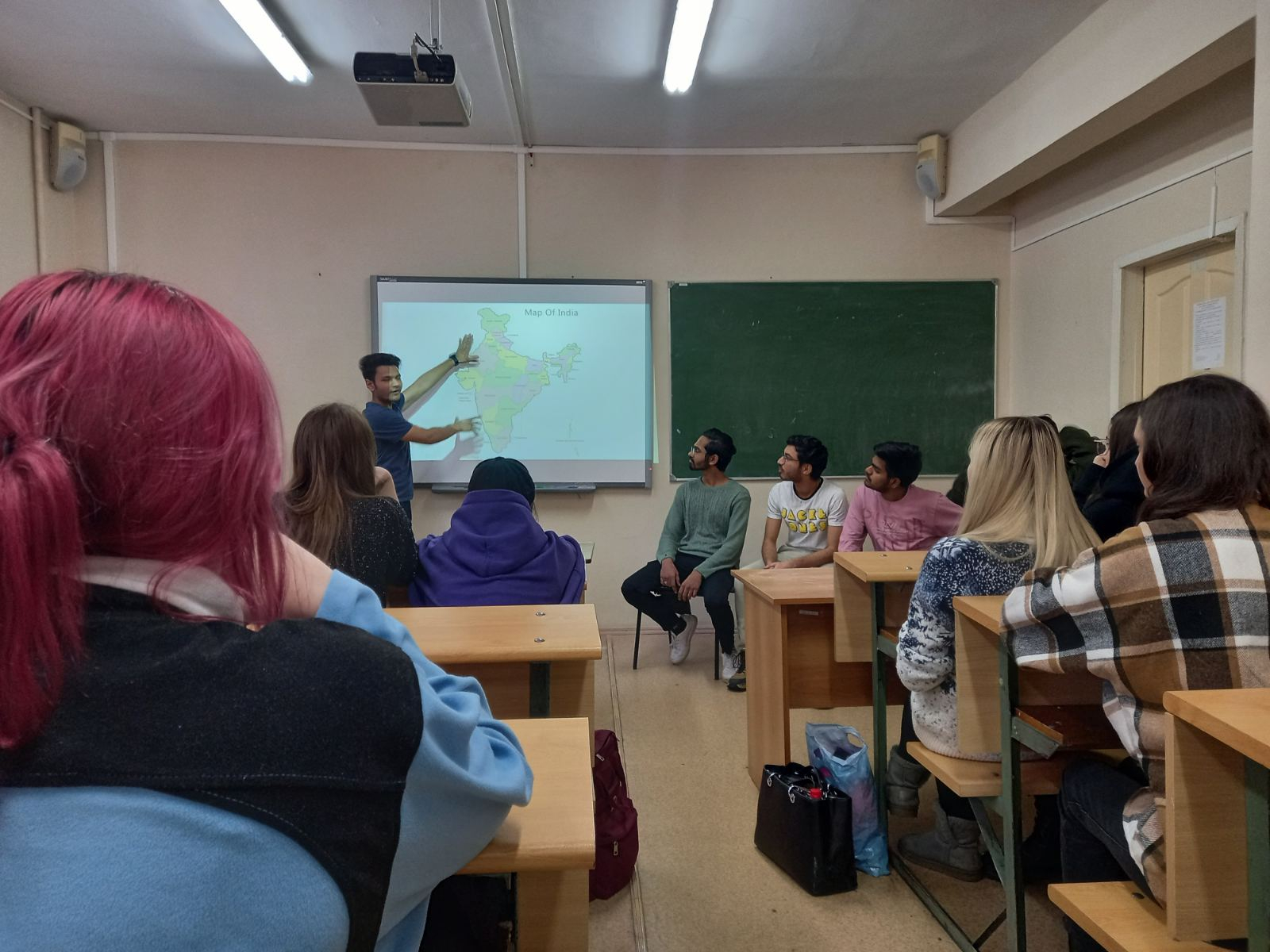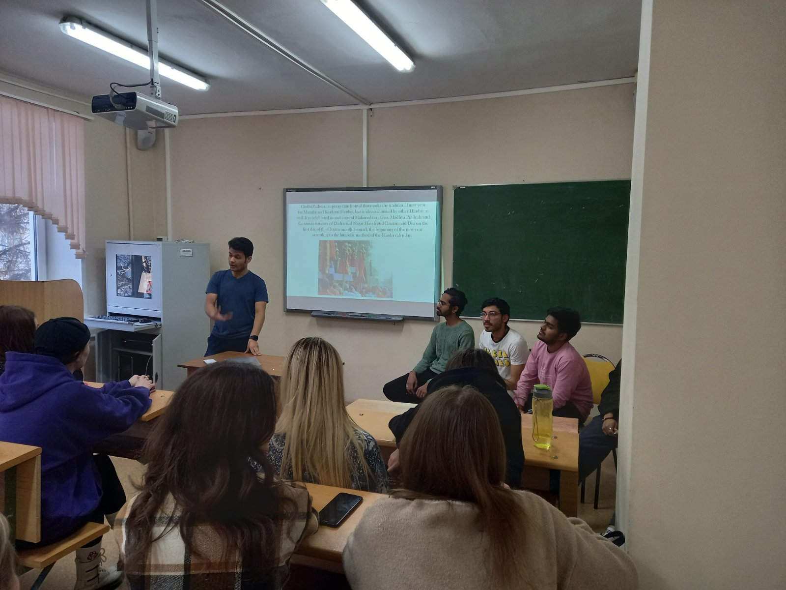 Мероприятие началось с очень красочной презентации, которую подготовили студенты из Индии. Она сопровождалась захватывающим выступлением старосты группы 22ЛЛ2а Шлоком Кширсагаром. Доступность и четкость речи выступающего, а также иллюстрированное сопровождение мотивировали студентов на дальнейшее общение. Для русских студентов было необычно узнать, что в Индии принят другой календарь, поэтому Новый год у них празднуется в марте. Также студенты узнали о необычных атрибутах и символах Гуди Падва и многом другом. После презентации студенты задали друг другу интересующие их вопросы. Встреча оказалась очень плодотворной и вызвала массу эмоций.