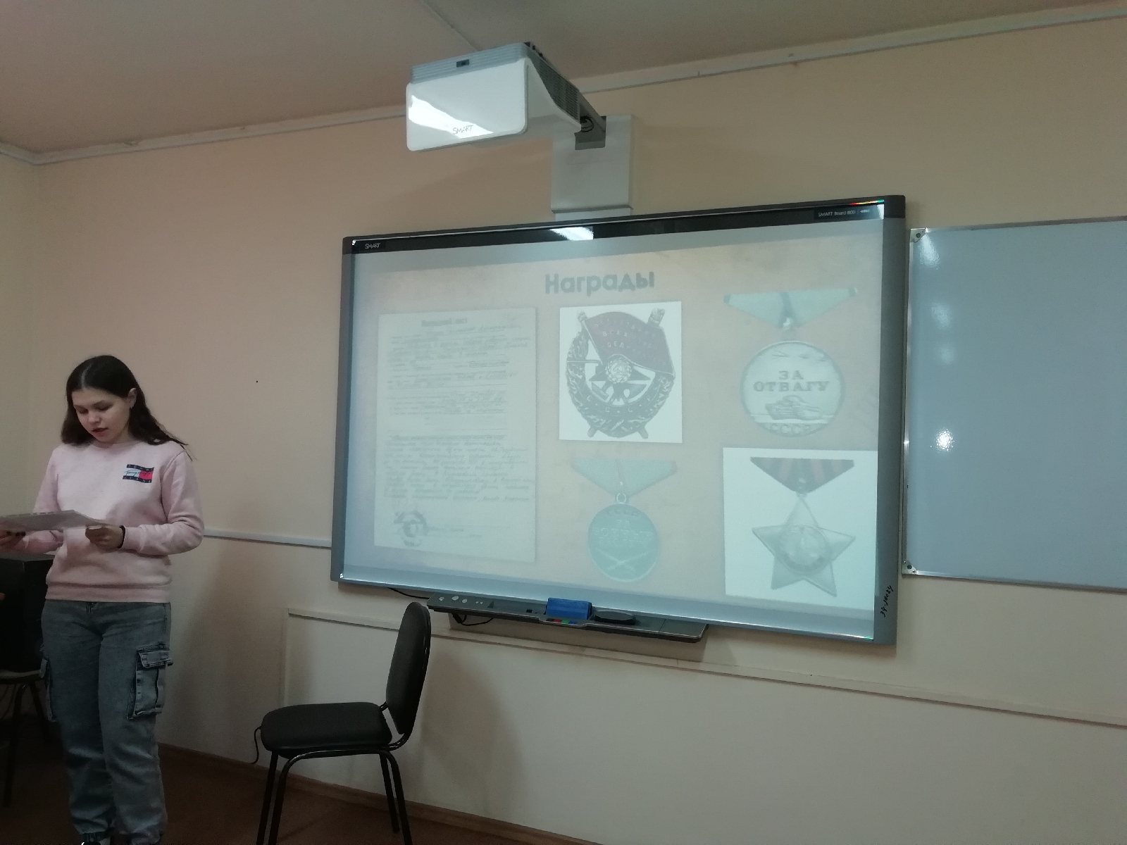 Учащиеся групп 22НПН1 и 22НПН2 подготовили сообщения об участии своих родственников в ВОВ. Студенты рассказали о героическом прошлом своих прадедов и прабабушек, о том, как они уходили на войну со своей малой родины, где закончили войну, о подвигах во время войны на поле битвы и в тылу, работая на Великую Победу. Студенты подготовили презентации, принесли фотографии военных лет, копии наградных документов, электронные дневники. Все это вызвало большой интерес у присутствующих.