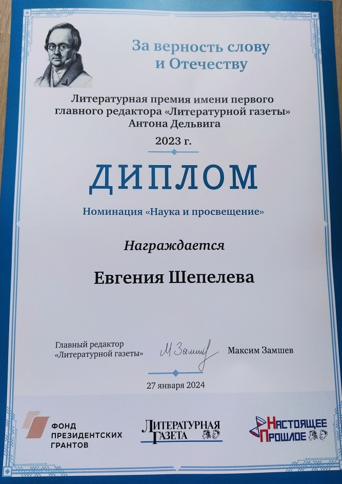 26-27 января 2024 г. в г. Москва состоялись итоговые мероприятия проекта «Настоящее Прошлое» (спецпроект «Литературной газеты»), в которых приняла участие доцент кафедры «Иностранные языки» Е.В. Шепелева Ежегодная Премия имени первого главного редактора «Литературной газеты» Антона Дельвига «За верность слову и Отечеству», учрежденная «Литературной газетой», вручается литераторам, историкам и просветителям, авторам лучших произведений, пишущим на русском языке. Премия присуждается в двух главных номинациях «Художественное слово» и «Наука и просвещение». Статья Е.В. Шепелевой, написанная совместно со студентом ПГУ гр. 22ФХ А.С. Растрёпиным «Влияние заимствований из западноевропейских языков на развитие русского языка в восемнадцатом веке» вошла в короткий список Премии им. А. Дельвига «За верность слову и Отечеству» 2023. Е.В. Шепелева и А.С. Растрёпин были награждены Дипломами в номинации «Наука и просвещение» (Исследование).