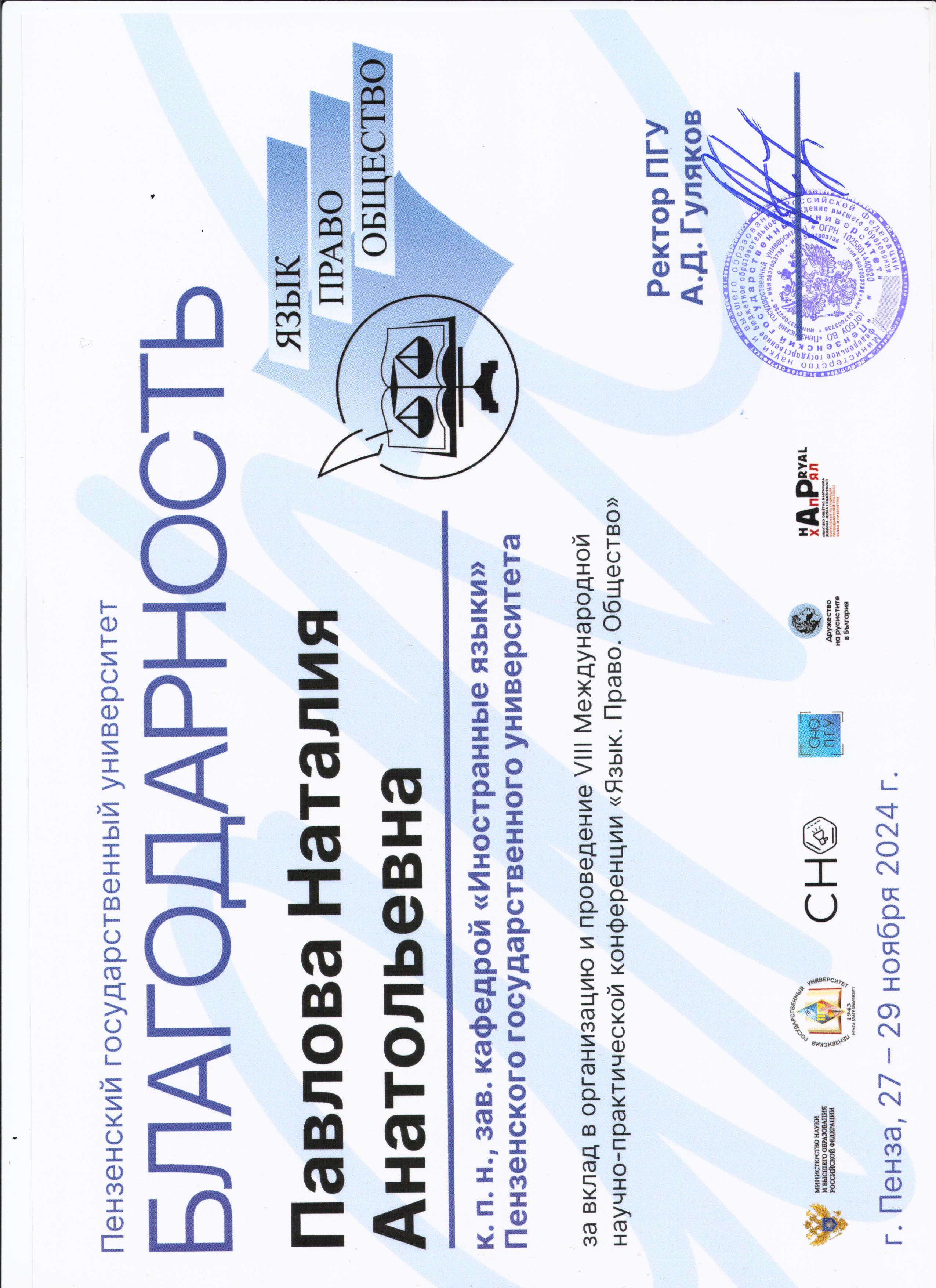 За активное участие и подготовку конференции Н.А. Павлова получила благодарность ректора ПГУ А.Д. Гулякова.