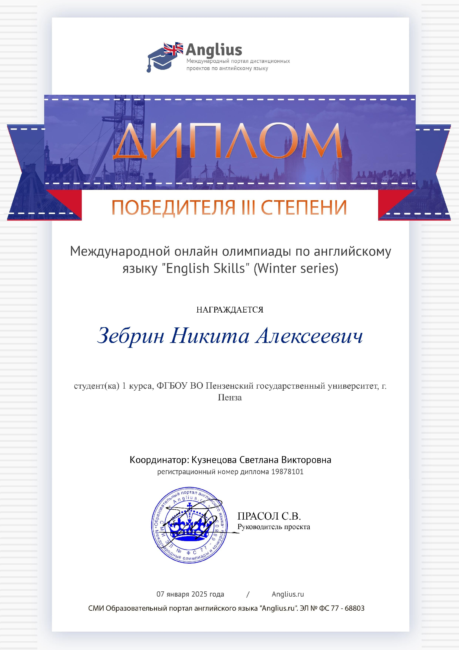 Под руководством доцента С.В. Кузнецовой студент группы 24 ФпР1 Зебрин Никита принял участие в Международной онлайн олимпиаде по английскому языку «English Skills» (Winter series) на Международном портале дистанционных проектов по английскому языку Anglius для студентов и занял III место. Поздравляем Никиту и его научного руководителя!