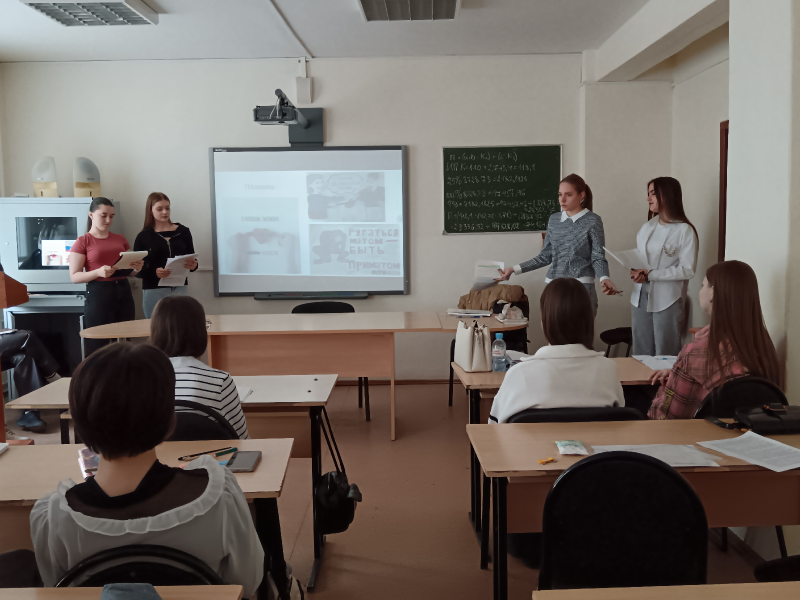 Студенты-ведущие организовали командную игру по созданию антирекламы сквернословию, а также вспомнили пословицы и поговорки, которые существуют в русском языке на эту тему. Затем была проведена эстафета «добрых слов».