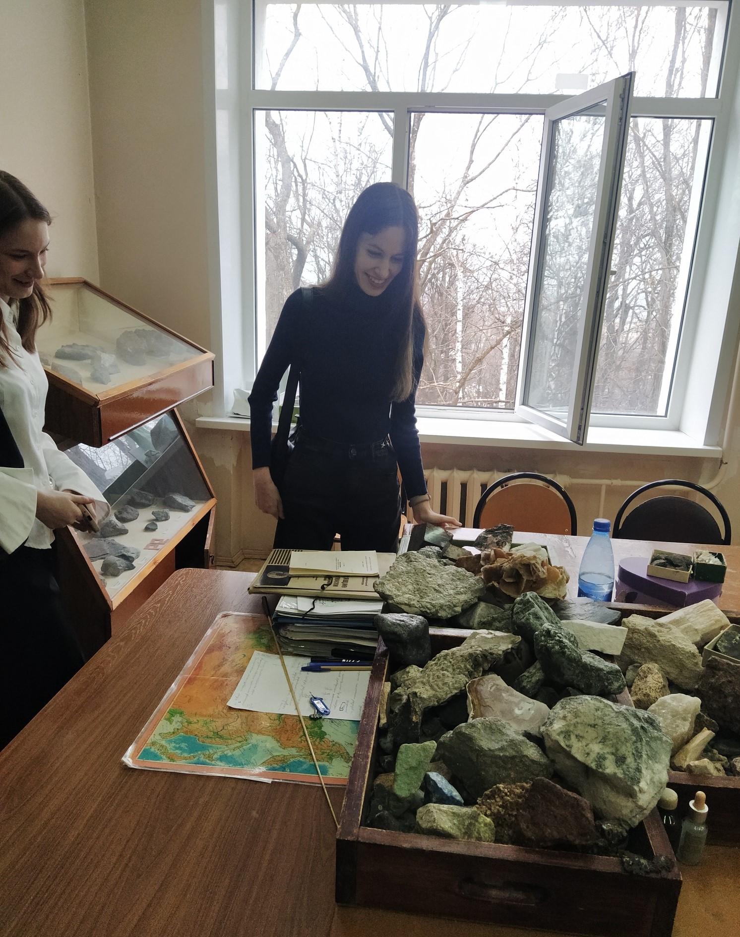 Кроме этого, для школьницы была проведена экскурсия по 15 учебному корпусу. Она заглянула в химическую лабораторию, посетила минералогический музей и кабинет геологии, где послушала рассказ о минералах. Также Лилия с удовольствием прошла по второму этажу и узнала о том, как и где изучают ботанику. Закончилась экскурсия на первом этаже посещением зоологического музея.